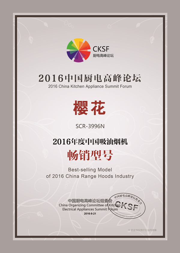 SAKURA天富平台登录注册荣获“2016年度中国吸油烟机畅销型号”