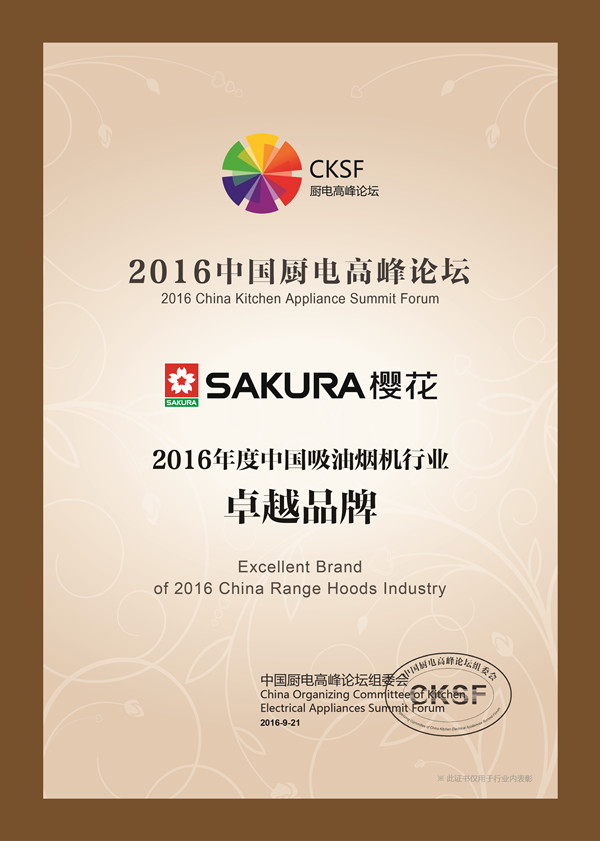 SAKURA天富平台登录注册荣获“2016年度中国吸油烟机行业卓越品牌”
