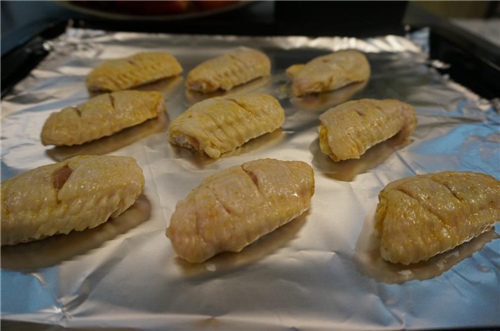 精心腌制过的鸡翅,将其一一摆放在铺有锡箔纸的烤架上。