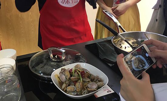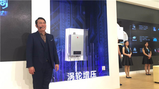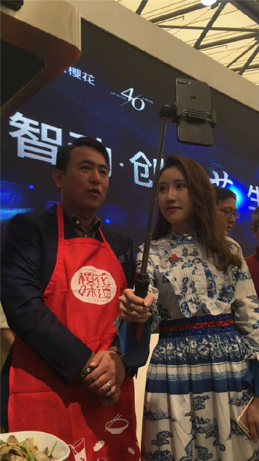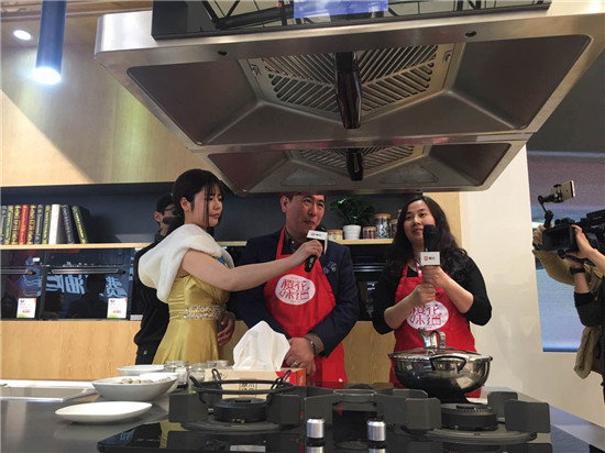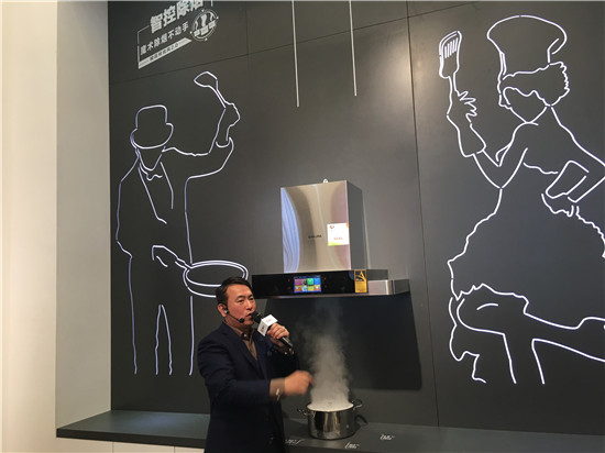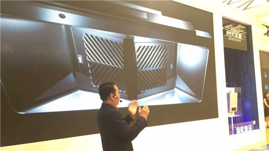 10:55 黄总现场演示双旋风智能2.0系统油烟机。黄总说,这款油烟机会根据油烟量自动控制风量,另外还配有五星菜谱功能。