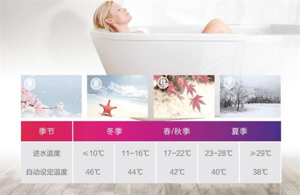 用户一键点选“智能温”模式后,E99SA可根据四季温度变化,自动设定适宜的洗浴温度,夏天进水温度较高的时候,热水器自动设定38℃,春秋季节根据进水温度的不同,相应的出水温度分别是40℃、42℃,冬天室外温度很低,热水器会根据进水温度自动调节到44℃或46℃,人性化贴心关怀,让消费者省心。